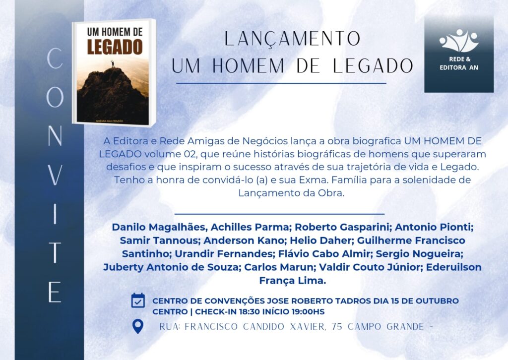 No próximo dia 15, às 19 horas, no auditório da Fecomércio/MS, em Campo Grande, acontecerá o lançamento da segunda edição do livro “Um Homem de Legado”, com noite de autógrafos. Será no Centro de Convenções José Roberto Tadros, na Rua Francisco Cândido Xavier, 75, em Campo Grande. A obra, produzida em formato de coautoria, traz […]
