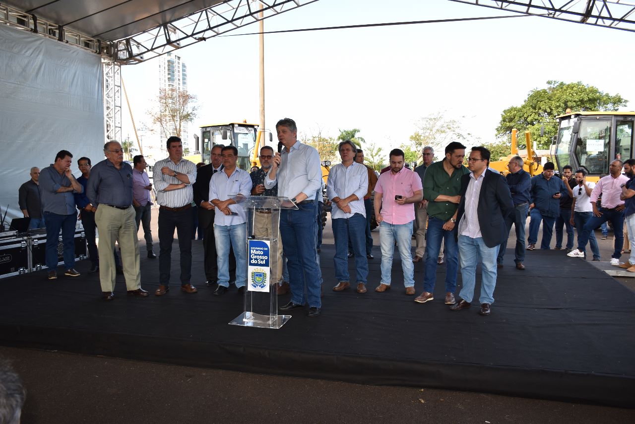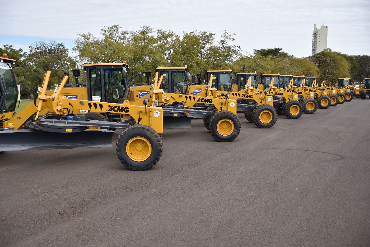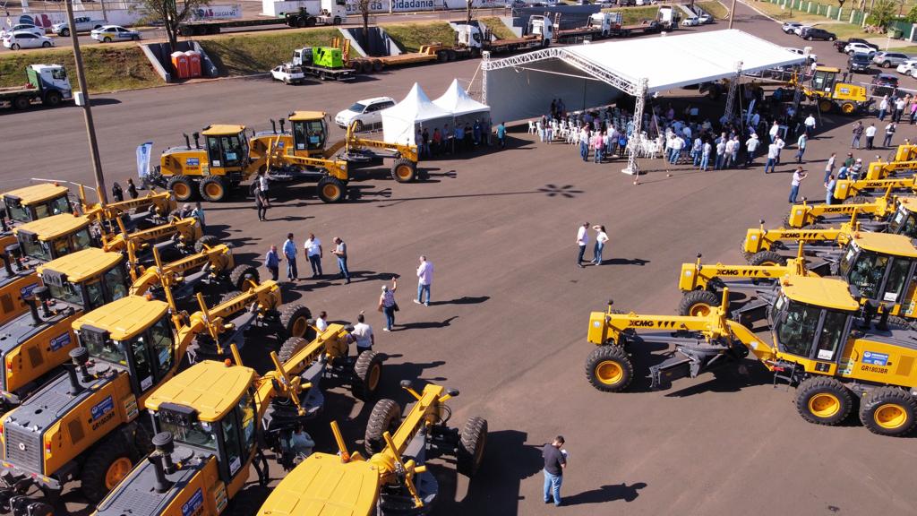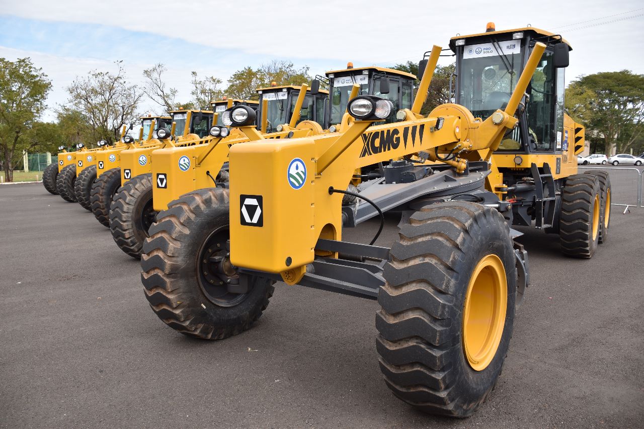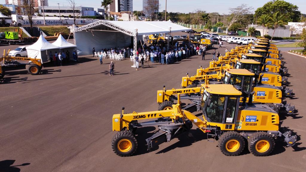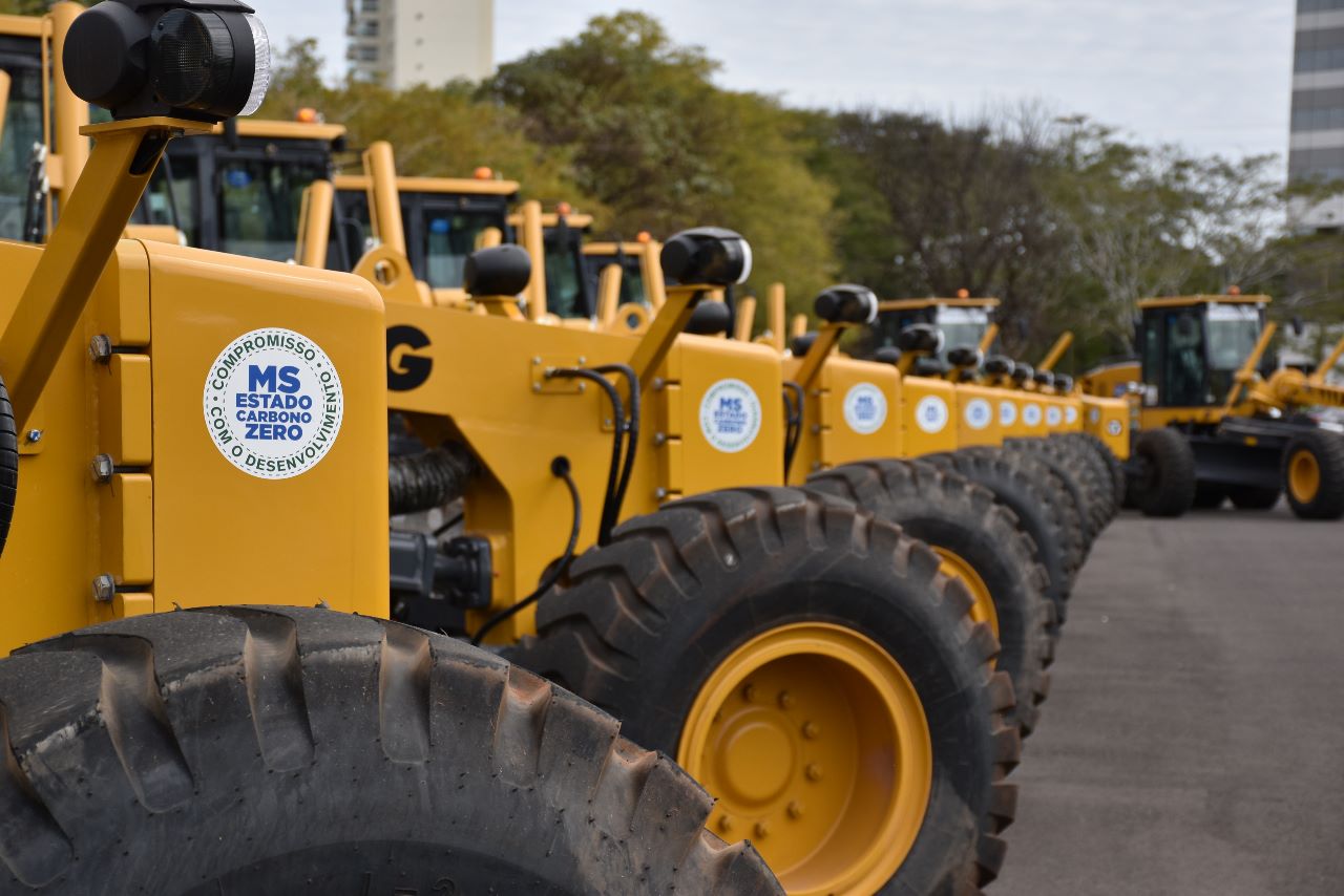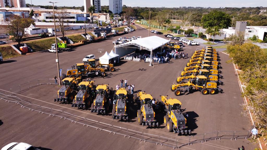 Dezenove motoniveladoras foram entregues pelo Governo do Estado a 19 prefeituras municipais para o trabalho de manutenção de estradas vicinais e conservação do solo e da água. A entrega foi realizada no estacionamento do Buffet Yotedy, pelo governador Eduardo Riedel, juntamente com o secretário Jaime Verruck, da Secretaria de Meio Ambiente, Desenvolvimento, Ciência, Tecnologia e Inovação e contou com a presença dos 19 prefeitos e representantes dos municípios contemplados, do superintendente de Agricultura e Pecuária em MS, José Roldão, que representou o ministro Carlos Fávaro, da Agricultura, Pecuária e Abastecimento.